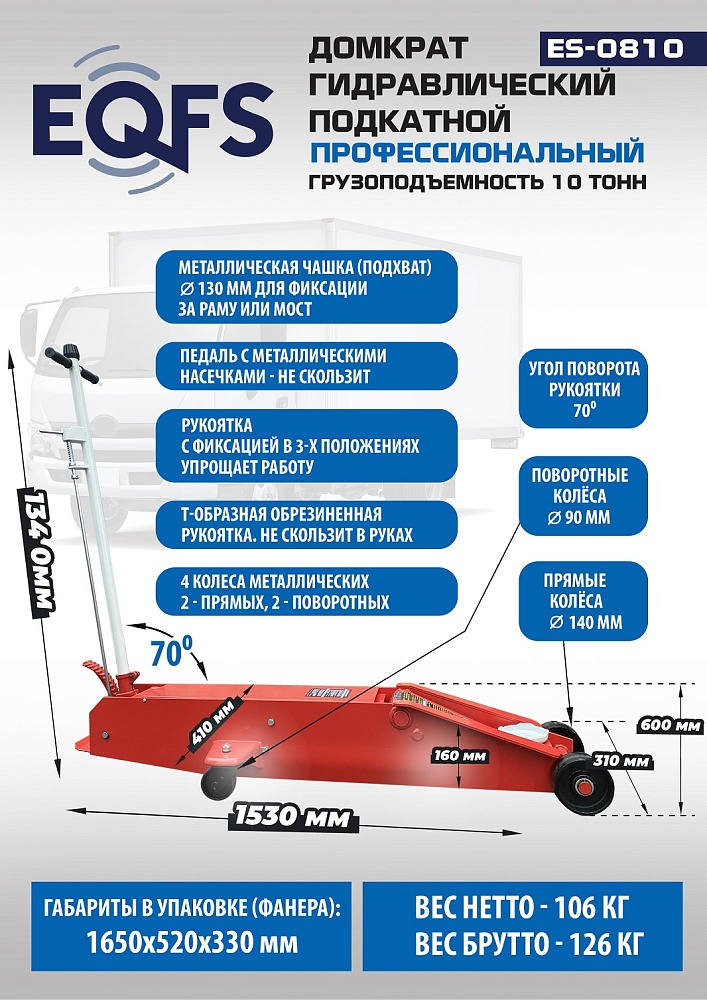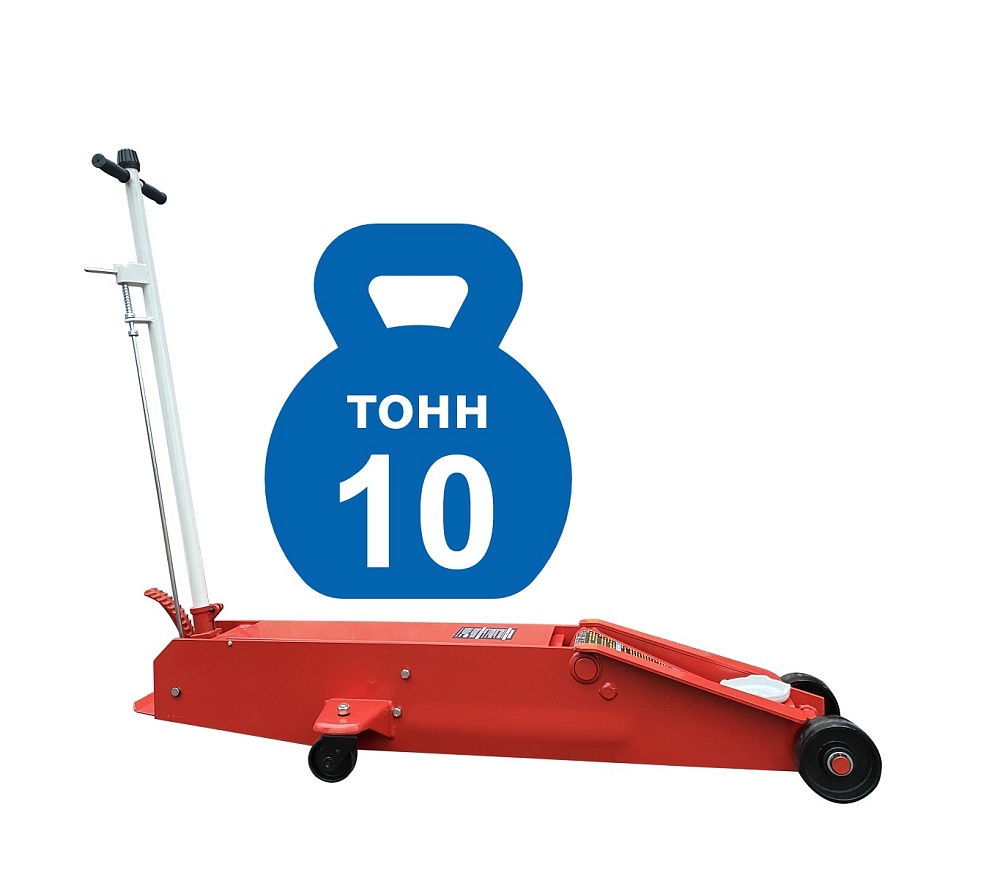 Увеличенная длина домкрата позволяет производить подхват под раму и мосты грузовых автомобилей. Ножной привод позволяет быстро подводить опорную чашку (подхват) до нужной высоты. Клапан защиты от перегрузки. Рукоятка привода составная с обрезиненной ручкой – предотвращает случайное повреждение дверей автомобиля. Домкрат рекомендуется к применению в шиномонтажных мастерских, автосервисах и авторемонтных предприятиях. Высота подъема 165-600 мм. г/п 10 т.