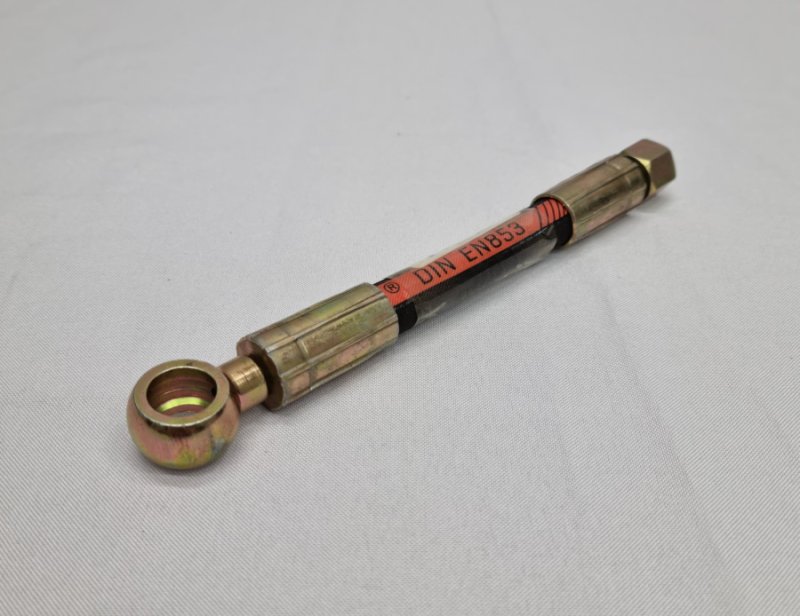 Гидравлический рукав с фитингами, для подключения линии от гидравлической станции к цилиндру. Параметры рукава: размер 5/16". Длина:180 мм. Рабочее давление: 35Mпа Фитинги: М14х1,5мм., размер ключа 19мм. / поворотное соединение (Банджо) под болт ? 14мм. Применяемость: Подъемник двухстоечный ПГН2-5.5
