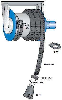 Катушка со шлангом для удаления выхлопных газов (шланг 8,0м. х Ø127 мм)   Механическая пружина возврата шланга. Комплект поставки: шланг из термостойкого армированного эластомера (TPE)., резиновое газоприемное сопло с рукояткой, стопор, салазки для крепления.