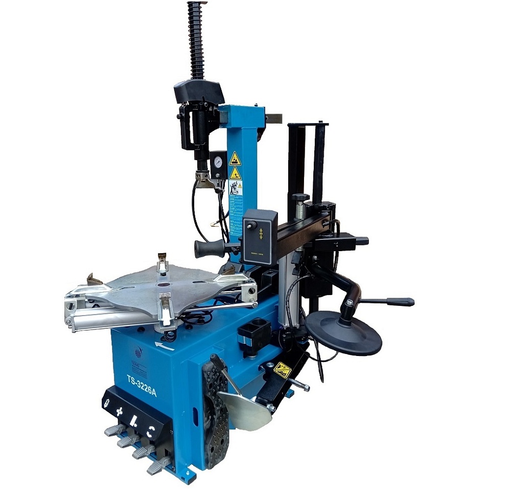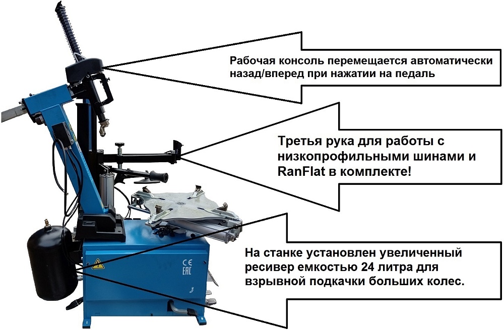 Автоматического шиномонтажного станка TS-3226А. Для дисков: 11÷24”. В комплекте: полноценная 3-й рука для работы с жесткой и низкопрофильной резиной RUNFLAT. + встроенный бустер 24 литра (взрывная подкачка) + пистолет для подкачки шин + монтажка + регулятор давления с влагоотделителем и манометром.