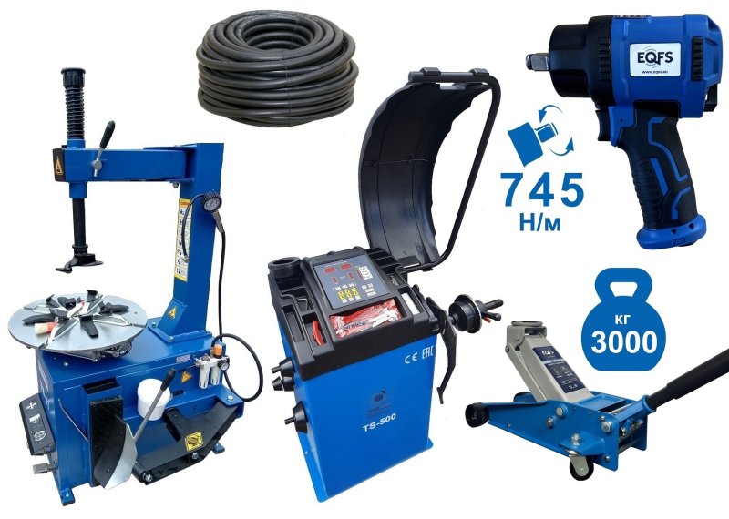 В комплекте также присутствует гидравлический подкатной домкрат с усиленной конструкцией, двухплунжерный механизм быстрого подъема. Высота подъема 120-460 мм. Облегченный – 35кг. Профессиональный г/п 3,0т. С педалью. Не текут, не ломаются + ударный пневмогайковерт, 1/2", крутящий момент 760Нм, все это позволяет производить шиномонтаж и балансировку колес до 22" включительно.