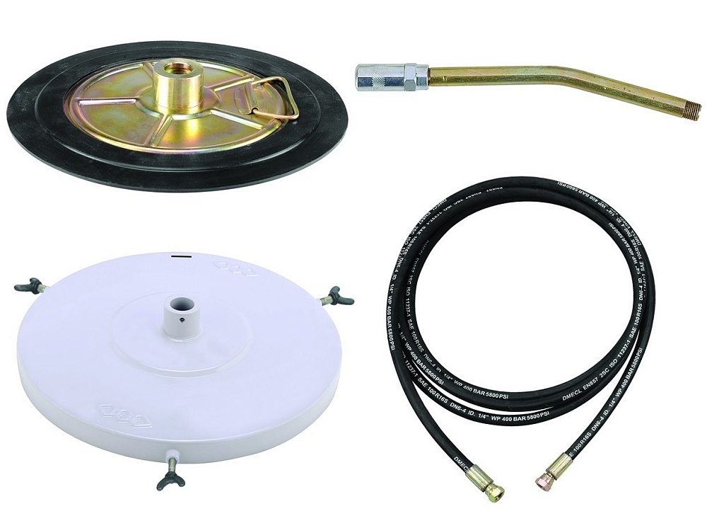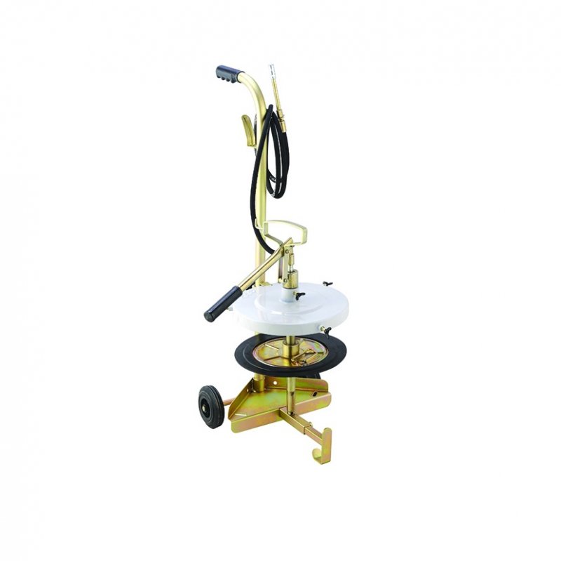 Нагнетатель смазки (густой). Комплект оснащен тележкой для бочек 20-60 кг., насос для смазки ручной производительностью 300 гр/мин, мембрана и крышка для солидолонагнетателя, шланг 4 м, раздаточный пистолет с наконечником. При давлении воздуха 6-8 Атм давление смазки 400 Атм максимально. Колёса: 2 прямых. Масса: 12 кг.