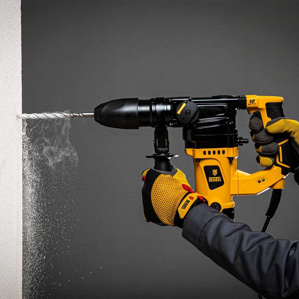<p>Компактный электрический перфоратор Denzel RHV-1100-26 26610 мощностью 1100 Вт, с патроном под хвостовик SDS-plus, развивает энергию удара 4 Дж и обеспечивает эффективную работу в режимах сверления, бурения и отбойного молотка. Подходит для штробления стен и демонтажа кафеля, легко справляется с древесиной, металлом, камнем, кирпичом и бетоном. Проделывает отверстия в бетоне диаметром до 26 мм, в древесине до 40 мм и в металле до 13 мм. Инструмент будет полезен для проведения строительных и ремонтных работ.</p><h2>Преимущества</h2><ul><li>Долгий срок службы — корпус изготовлен из ударопрочного пластика, медная обмотка двигателя обеспечивает длительную стабильную работу.</li><li>Легкий выбор нужного режима — скорость вращения оснастки и частота удара плавно регулируются в диапазоне 0-850 об/мин и 0-4100 уд/мин соответственно.</li><li>Высокое качество проводимых работ — специальный ограничитель позволяет задать требуемую глубину сверления для получения одинаковых отверстий.</li><li>Быстрая подготовка к работе — оснастка с хвостовиком SDS-plus легко устанавливается и надежно фиксируется в патроне.</li><li>Безопасность — предохранительная муфта препятствует вращению оснастки в случае заклинивания бура.</li><li>Возможность непрерывной работы — кнопку включения можно зафиксировать, чтобы не удерживать ее постоянно.</li><li>Удобное использование — индикатор включения сигнализирует о готовности инструмента к работе.</li><li>Электробезопасность — токопроводящие элементы имеют двойную изоляцию.</li><li>Простое обслуживание — конструкцией предусмотрен быстрый доступ к угольным щеткам и индикатору ресурса щеток.</li><li>Кабель питания с резиновой изоляцией — работать инструментом допустимо при низкой температуре (не ниже 0°С).</li><li>Комфортная эксплуатация — инструмент весит всего 4,3 кг, пружинно-шарнирная антивибрационная система уменьшает нагрузку на руки.</li><li>Удобное хранение и транспортировка — перфоратор с оснасткой упакован в прочный кейс.</li><li>Гарантия 3 года — высокое качество перфоратора подтверждено производителем.</li></ul>