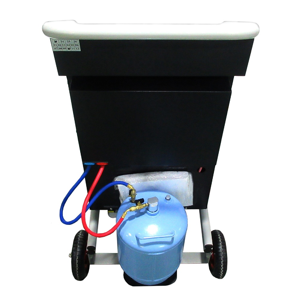 Станция гарантирует безопасную работу с системами кондиционирования. Встроенные электронные весы препятствуют переполнению бака, а интуитивно понятная панель управления оборудована тремя манометрами для точного контроля процесса от и до.