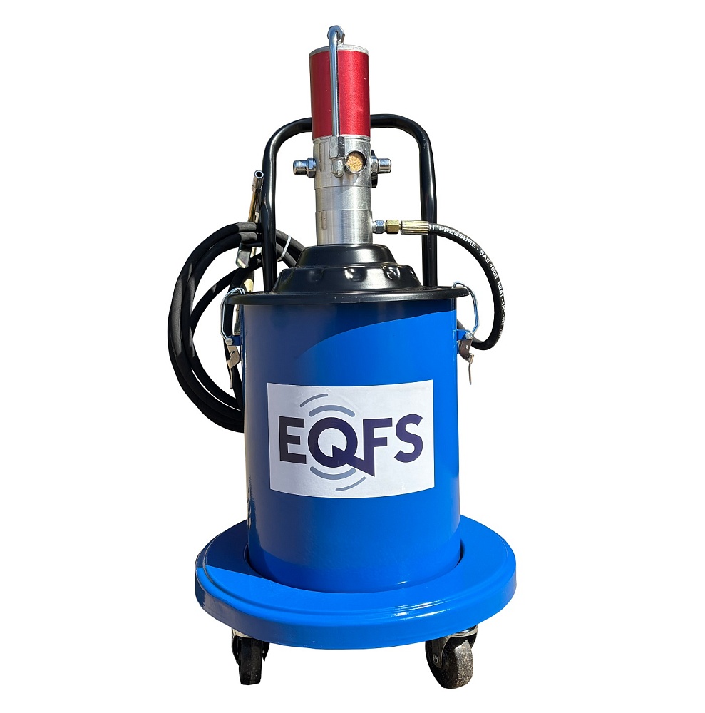 Мобильная установка для раздачи густых смазок в комплекте с тележкой, пневматическим насосом и маслораздаточным пистолетом.