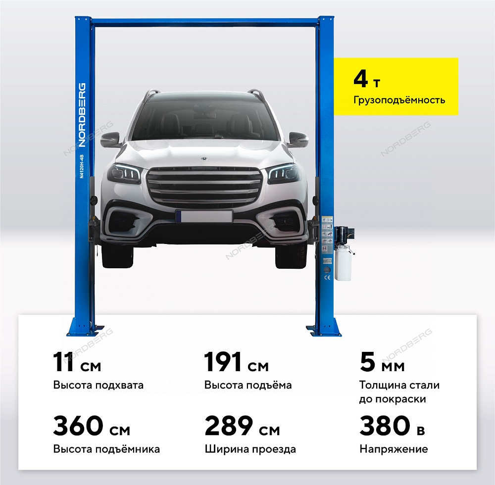 Подъемник двухстоечный 4 т, верхняя синхронизация, H=3,6 м, 220 В, синий NORDBERG N4120H-4B_3+2_220 купить в Челябинске цена ✅ - Все для СТО
