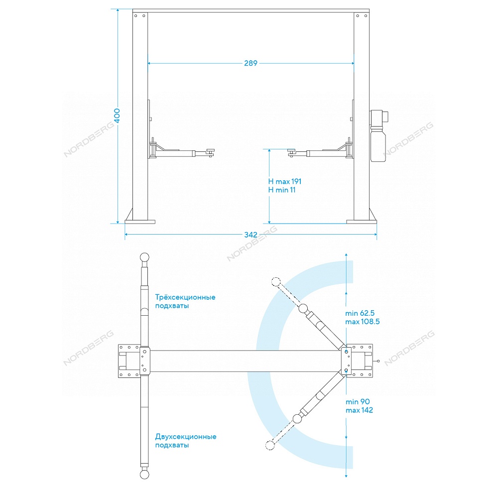 Подъемник двухстоечный 4 т, верхняя синхронизация, H=4 м, 220 В, серый NORDBERG N4120H1-4G_3+2_220 купить в Челябинске цена ✅ - Все для СТО