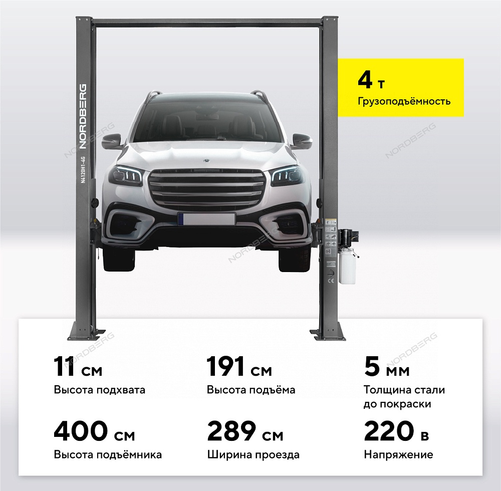 Подъемник двухстоечный 4 т, верхняя синхронизация, H=4 м, 380 В, серый NORDBERG N4120H1-4G_3+2_380 купить в Челябинске цена ✅ - Все для СТО