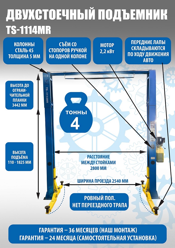 TS-1114MR подъемник 4 т, 2-х ст. электрогидравлический (2025) (380 V ТВ) купить в Челябинске цена ✅ - Все для СТО