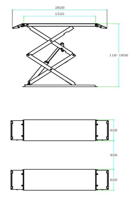 Подъемник комплект (2 платформы, 2 гидр, цилиндра, гидростанция) ножничный, электрогидравлический, напольный, г/п 3500 кг., 2,2 кВт, высота подъема 1850 мм., размеры платформ 1535-2020х620 мм., клиренс 110 мм.