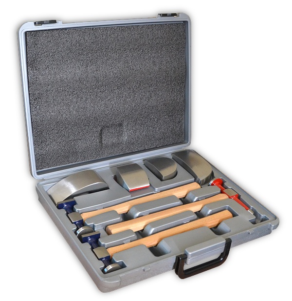 Набор из 7-ми приспособлений для кузовных работ в кейсе: 3 молотка + 4 поддержки.
