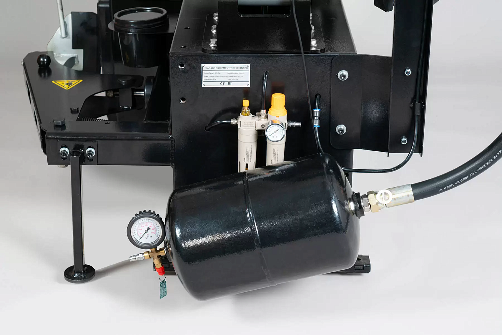 Манометр контроля давления воздуха смонтирован на монтажной стойке. Накачка - нажатием ногой на педаль.