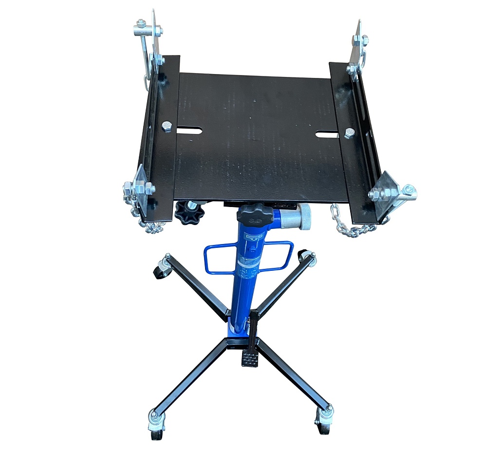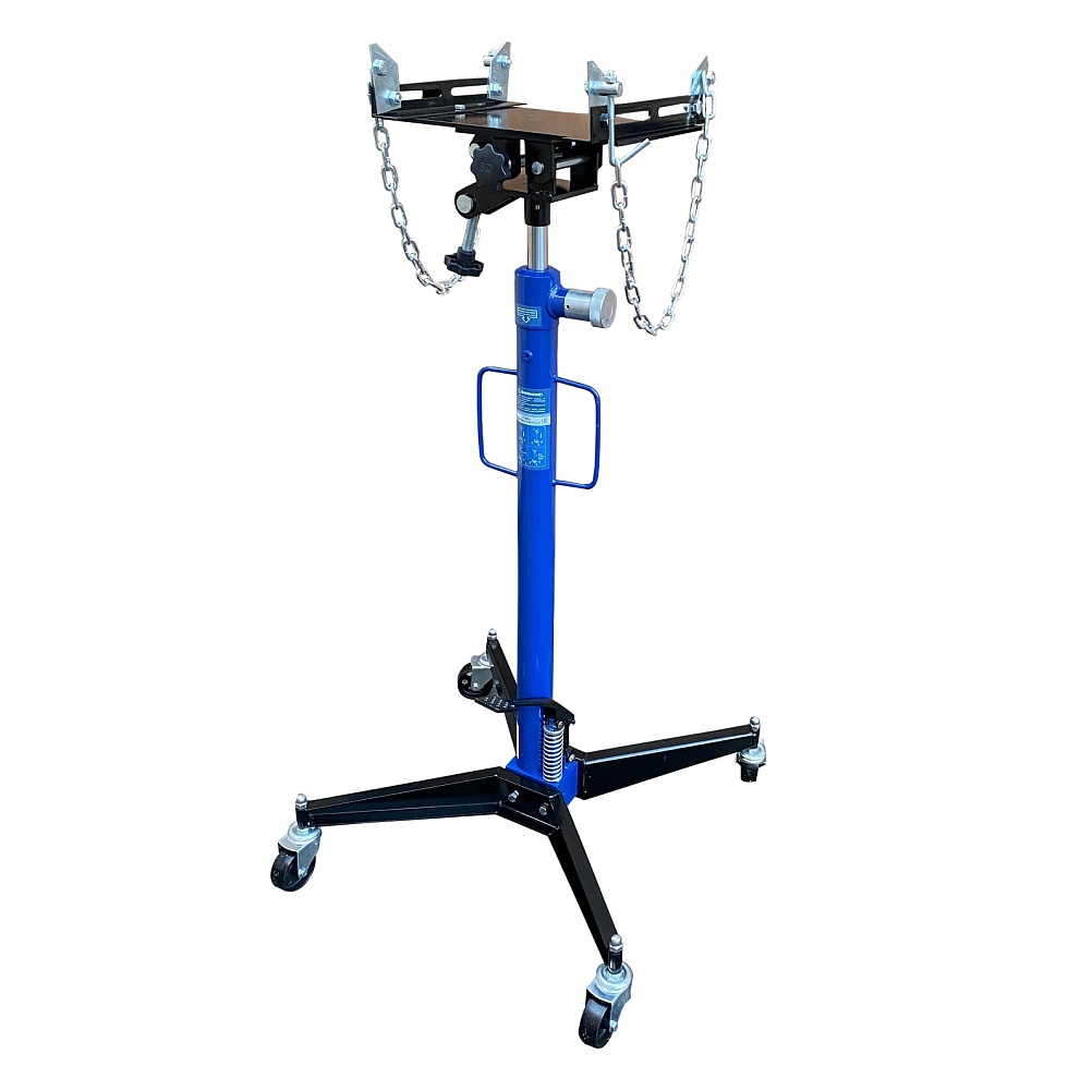 Трансмиссионная стойка грузоподъемностью 500 кг предназначена для монтажа и демонтажа узлов трансмиссий, КПП, тормозных суппортов и других агрегатов на смотровой яме, эстакаде или подъемнике. Оснащена специальной площадкой с цепями для фиксации деталей и транспортировки по цеху. Гидравлический цилиндр с клапанным блоком и возвратной пружиной обеспечивает плавный подъем от 1180 до 2005 мм.