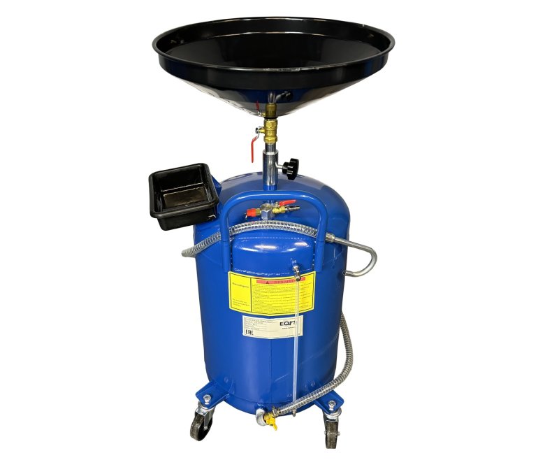 В комплекте всё необходимое: сливная чаша, пистолет для откачки, прозрачная трубка уровня и колёса для лёгкого перемещения по цеху.